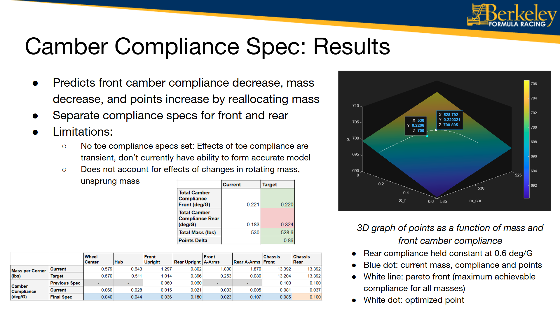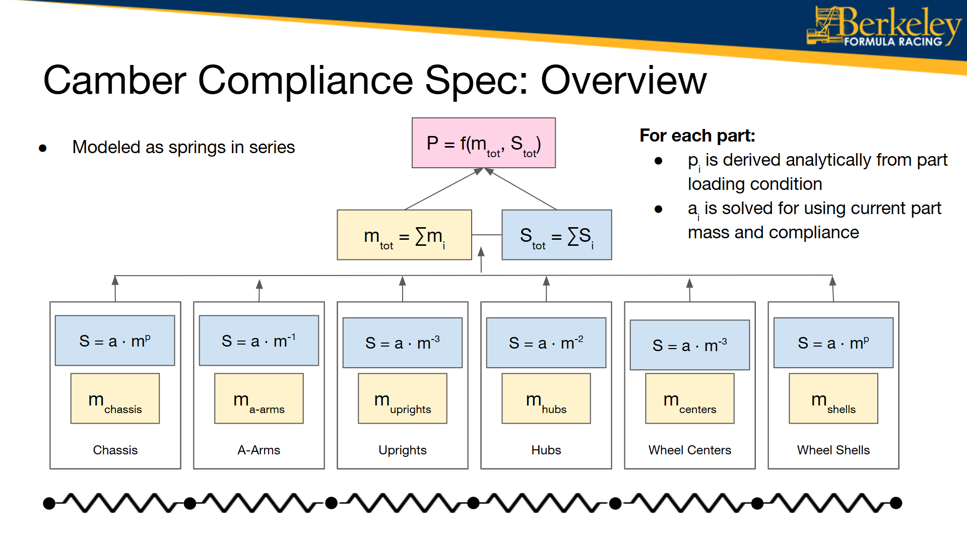 This project involved the creation of a model to set systems level compliance specifications for our B26 FSAE car, and optimize the distribute of camber compliance design specifications between all parts that are structurally loaded under cornering.